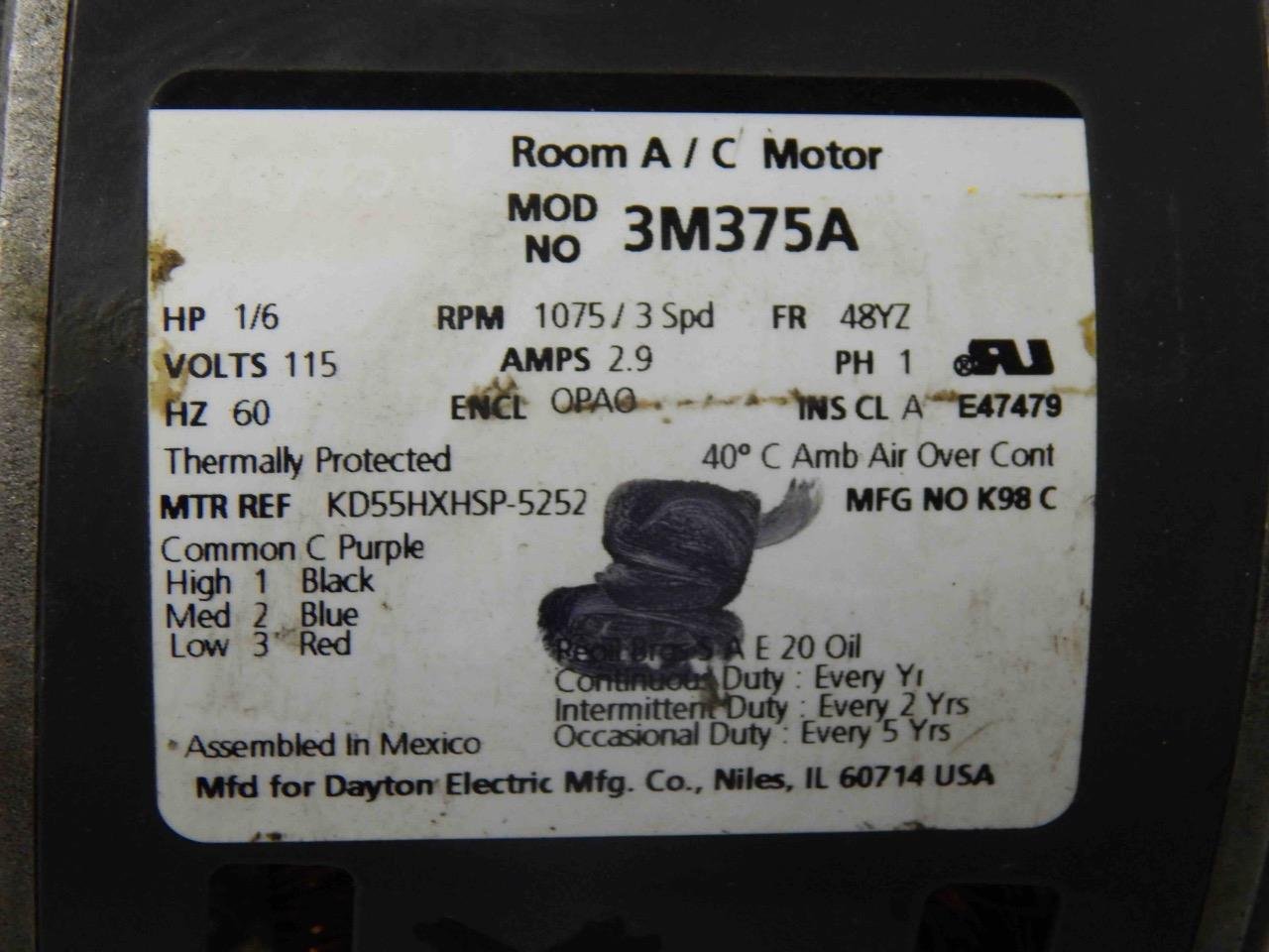 #14 Dayton 3M375A 1/6HP RPM 1075/3 Spd 48YZ Fr 115V 1-Ph ​KD55HXHSP-5252 Motor
