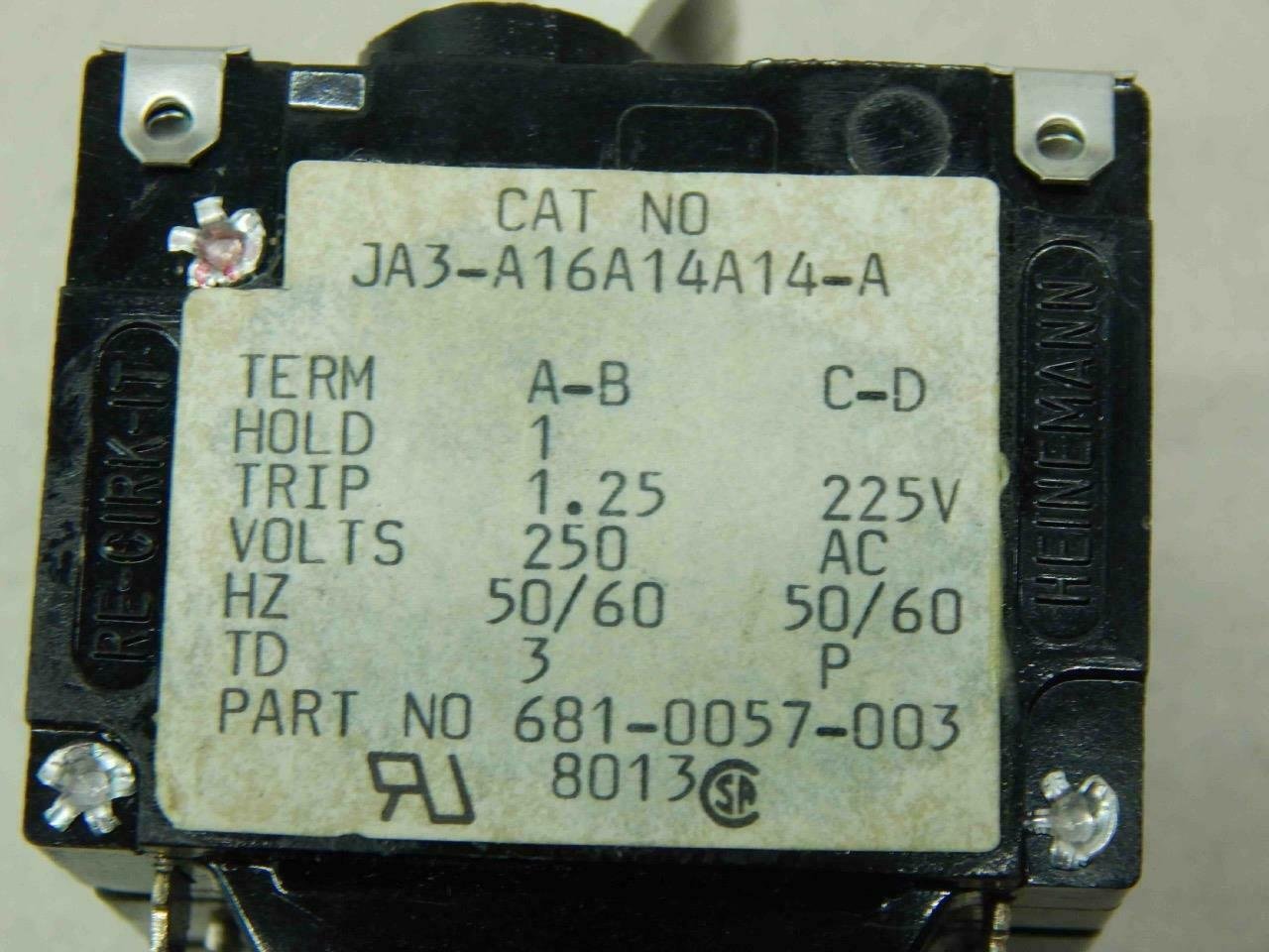 Heineman JA3-A16A14A14-A Breaker, 3 Pole Pulled From Perkin Elmer 300HT, Model 340 Micralign Aligner –